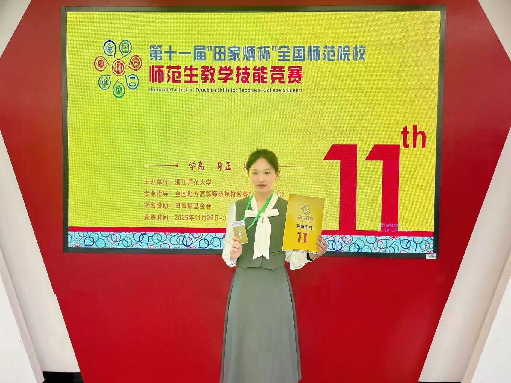 11月28日至11月30日,第十一届“田家炳杯”全国师范院校师范生教学技能竞赛决赛在浙江师范大学举行。经过激烈角逐,公司数学与应用数学专业2022级4班刘雨欣表现卓越,荣获数学与应用数学组一等奖。