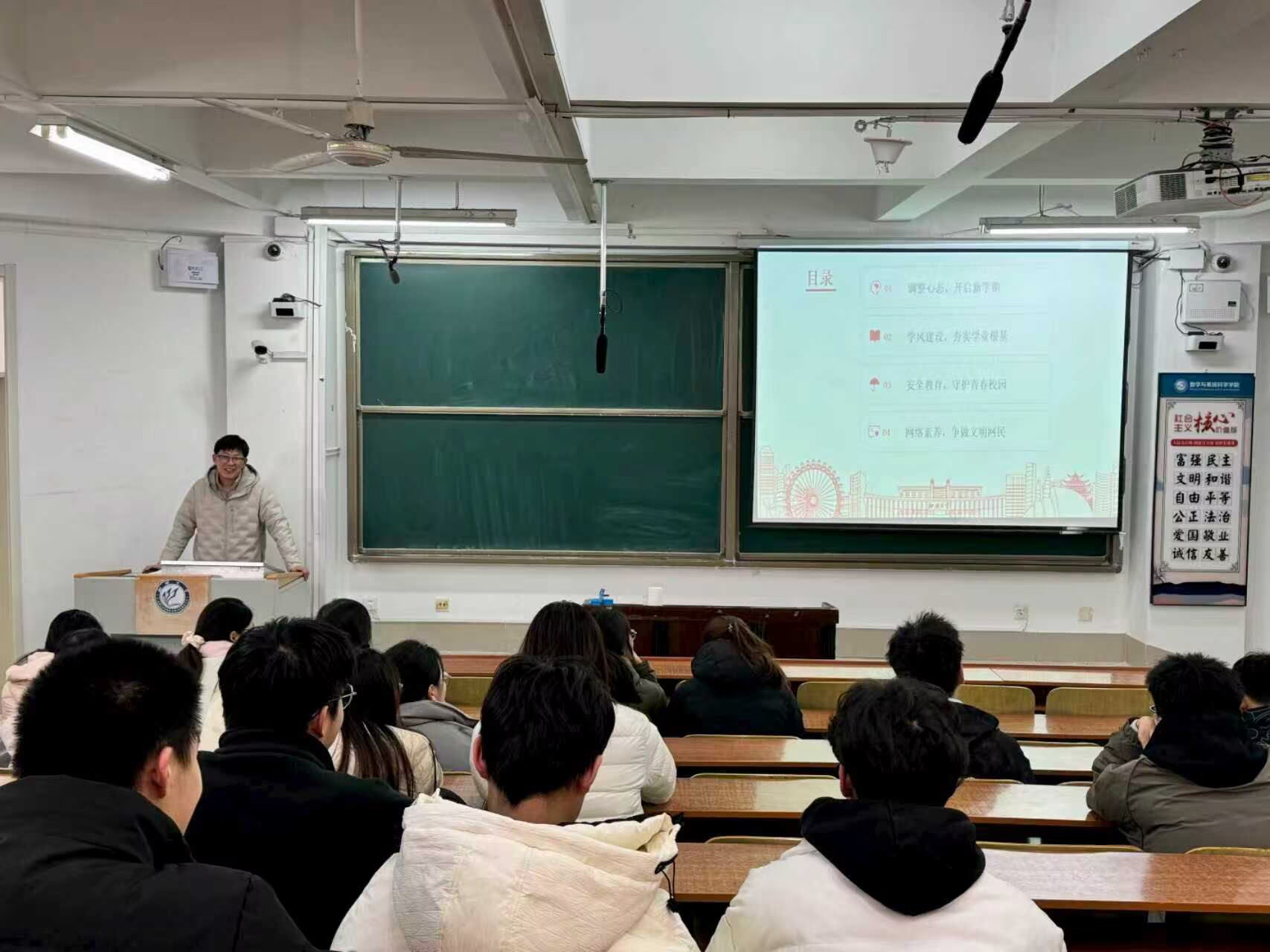 为帮助员工明确新学期方向,增强员工安全意识,夯实学院优良学风根基,3月8日至9日,数学与系统科学学院组织各年级同学开展“开学第一课”主题班会。本次班会由各班班主任主持,围绕心态调整、学风建设、安全教育、网络素养四大核心内容展开,为新学期各项工作的有序开展奠定坚实基础。